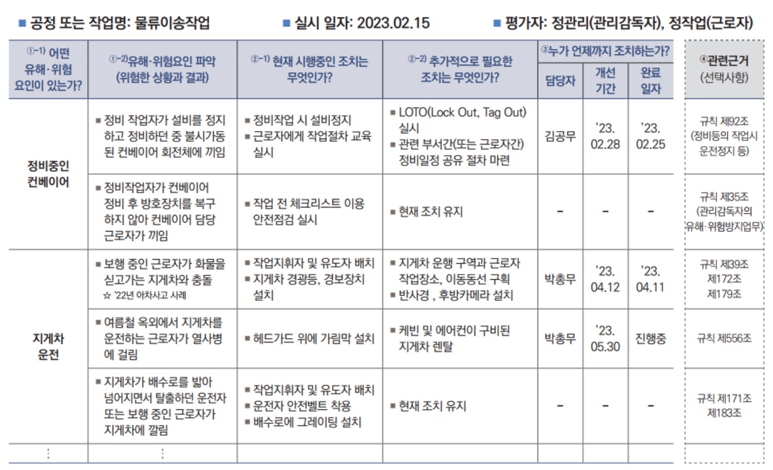 ⑥ 관련근거: 파악된 유해·위험요인과 관련된 법령 또는 관련 기준을 기록하여 개선대책 수립 시 활용(선택적 사항)